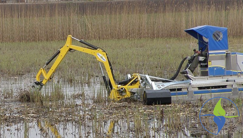Na prvoj slici je seča trske amfibijom, dok na drugoj se seče i usitnjava koren trske sa ciljem povećanja otvorene vodene površine. Tekst: Klara Sabadoš