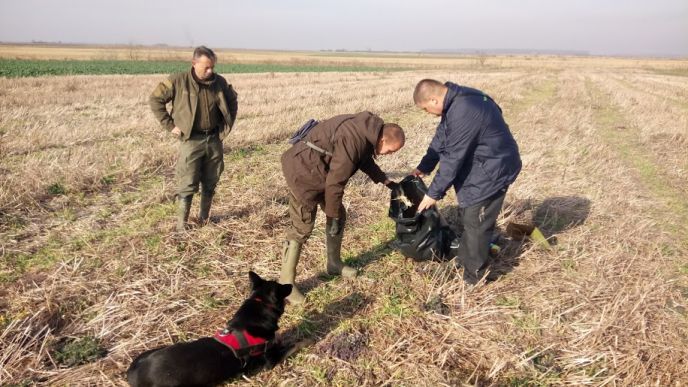 Nakon informacije od 18. novembra o pronađenom otrovanom orlu belorepanu kod Grabovaca, a usled sumnje da se na okolnom terenu nalazi još leševa divljih zaštićenih životinja, ekipa Pokrajinskog zavoda za zaštitu prirode, Društva za zaštitu i proučavanje ptica Srbije i Mađarskog društva za zaštitu ptica i prirode, detaljno je 24. novembra pretražila područje na kome je leš nađen. Ovog puta, član ekipe bio je i petogodišnji nemački ovčar Falko. Ovaj pas posebno je obučen za pronalaženje ostataka životinja i pesticida. Njegov izuzetno vredan rad omogućio je da se dođe do više tragova koji će, kako se stručnjaci nadaju, dovesti do otkrivanja tragova u ovom slučaju sumnje na krivično delo uništavanja posebno zaštićenih divljih vrsta.