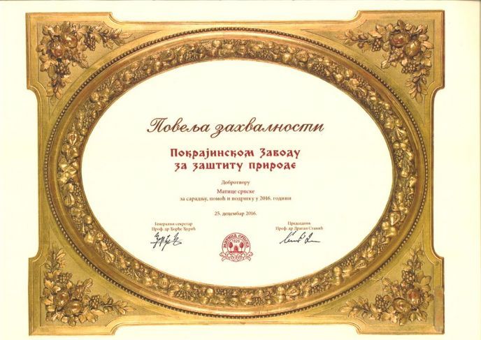 Pokrajinski zavod za zaštitu prirode je dobio Povelju zahvalnosti od Matice srpske u Novom Sadu. Povelja je Zavodu uručena 23. decembra 2016. godine na svečanosti Dan Dobrotvora koju ova naša najstarija srpska književna, kulturna i naučna institucija tradicionalno organizuje na izmaku svake godine. Povelju je uručio predsednik Matice prof. dr Dragan Stanić, a u ime Zavoda je primila direktorica dr Biljana Panjković. Zavod je dobio ovu povelju zbog uspešne saradnje, podrške i pomoći koju je pružio Matici pri izdanju Zbornika radova sa Botaničkog skupa održanog u maju 2016 godine.