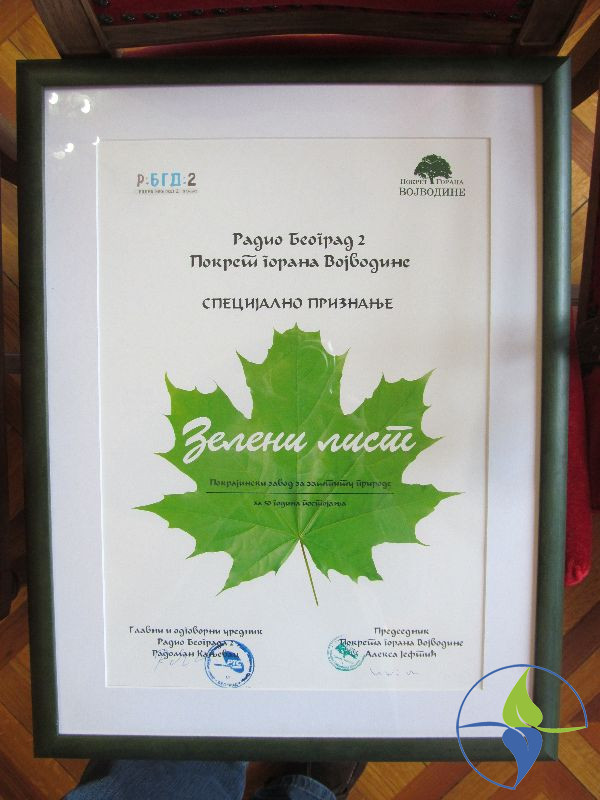 Specijalnu nagradu Zavodu je uručio glavni i odgovorni urednik Radio Beograda 2 Radoman Kanjevac, a ispred Zavoda priznanje je primila direktorica dr Biljana Panjković. U obrazloženju nagrade je navedeno: „Pokrajinski zavod za zaštitu prirode prošle godine je obeležio 50 godina postojanja i nastavio sa uspešnim aktivnostima. Zavod radi na uspostavljanju Ekološke mreže Vojvodine, prikupio je podatke o staništima zaštićenih i strogo zaštićenih vrsta, dobio je velike međunarodne projekte, sprovodi kampanju za zaštitu ptica od trovanja i aktivno se bavi edukacijom iz oblasti zaštite prirode. Tradicionalno dobro sarađuje sa ekološkim organizacijama i udruženjima građana koja rade na zaštiti prirode i životne sredine, kao i sa upravljačima zaštićenih prirodnih dobara u Vojvodini". Specijalne nagrade „Zeleni list" za 40 godina postojanja i rada na zaštiti prirode dobio je i Božidar Manduć („Porodica bistrih potoka") i Mladi Istraživači Srbije.