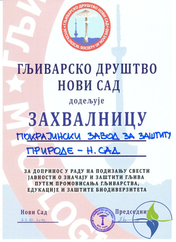 Gljivarsko Društvo Novi Sad je Pokrajinskom zavodu za zaštitu prirode dodelilo Zahvalnicu za doprinos u radu na podizanju svesti javnosti o značaju i zaštiti gljiva putem promovisanja gljivarstva, edukacije i zaštite biodiverziteta. Ovo i slična priznanja nas još više podstiču i obavezuju da nastavimo sa radom na zaštiti prirode kroz podršku raznih ekoloških i prirodnjačkih organizacija.