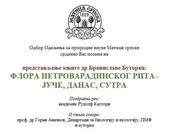 Knjiga dr Branislave Butorac "Flora petrovaradinskog rita - juče, danas, sutra" (Matica Srpska, 2018) biće predstavljena u sredu 20. novembra 2019. godine u 18 sati u prostorijama Matice srpske u Novom Sadu. Pozdravnu reč izreći će akademik Rudolf Kastori, a o knjizi će govoriti prof. dr Goran Anačkov, direktor Departmana za biologiju i ekologiju PMF-a u Novom Sadu i autorka, botaničarka Pokrajinskog zavoda za zaštitu prirode u penziji. Ulaz je slobodan.